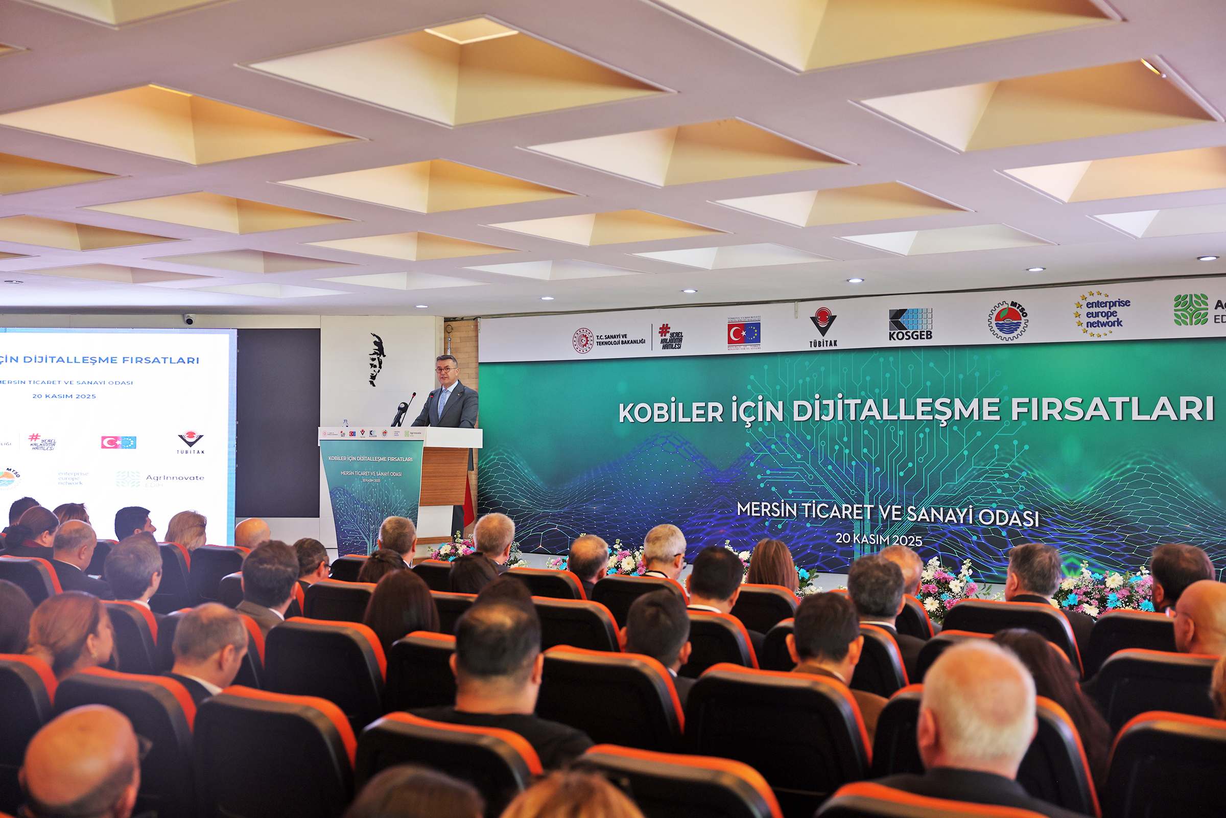 Sanayinin dijital dönüşümü için sağlanan desteklerin tanıtımı ve yaygınlaştırılması amacıyla Sanayi ve Teknoloji Bakanlığı Avrupa Birliği ve Dış İlişkiler Genel Müdürlüğü, KOSGEB Başkanlığı, TÜBİTAK Başkanlığı ve ilgili Bakanlık birimlerinin katkılarıyla ‘KOBİ’ler İçin Dijitalleşme Fırsatları’ etkinliği düzenlendi. Agrinnovate EDIH konsorsiyum ortağı ve EEN-EASTMED konsorsiyum ortağı olan Mersin Ticaret ve Sanayi Odası (MTSO) ev sahipliğindeki etkinliğe Yönetim Kurulu Başkanı Hakan Sefa Çakır, Meclis Başkanı Hamit İzol ve Yönetim Kurulu Üyeleri yanı sıra Mersin Valisi Atilla Toros, TÜBİTAK Başkanı Prof. Dr. Orhan Aydın, KOSGEB Başkanı A. Serkdar İbrahimcioğlu ile Sanayi ve Teknoloji Bakanlığı AB ve Dış İlişkiler Genel Müdür Yardımcısı Hande Merçan Aygen de katıldı. Etkinlik kapsamında konunun uzmanları katılımcıları, Dijital Avrupa Programı, Horizon Europe dijitalleşme çağrıları, EuroHPC girişimi, KOSGEB dijitalleşme destekleri ve Bakanlığın ulusal dijital dönüşüm programları hakkında bilgilendirdi. Soru cevap bölümü sonrasında Program, plaket töreni ve aile fotoğrafı çekilmesiyle son buldu.